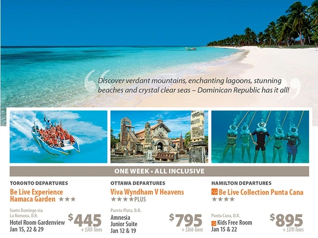The Dominican Republic is a sovereign state on the island of Hispaniola, in the Greater Antilles archipelago in the Caribbean Caribbean region. Though known for its wonderful beaches, all-inclusive resorts and golfing, it has a varied terrain comprising rainforest, savannah and highlands, including Pico Duarte, the Caribbean’s tallest mountain. For the adventure tourist this Caribbean country offers a diverse countryside comprising tropical rainforests, arid desert expanses, alpine ranges and steamy mangrove swamps. It's a playground for trekkers, mountain bike enthusiasts and water-sport junkies!