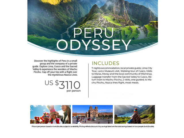 Peru is an extremely biodiverse country in western South America. From exotic jungle to coastal desert via the breathtaking peaks of the Andes, the country has the second highest number of bird species in the world. The main attractions are their archaeological patrimony of pre-Columbian cultures and the hub of the Inca's empire, their gastronomy, their colonial architecture (it has imposing colonial constructions) and their natural resources (a paradise for ecological tourism). Peru’s staggering variety of places to visit means the potential for adventure is boundless!