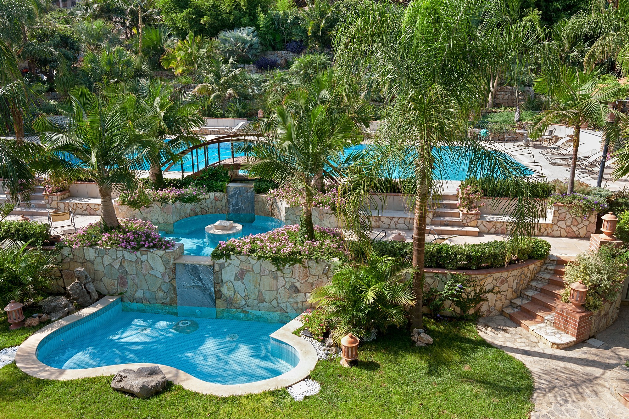 The villa is perfect for multi-generation gatherings. It boasts a sought-after position, only 50 meters from the shore with direct access to the rocky beach. It is set on a 10,000 square meter estate, rich with tropical plants and a lush vegetation. Three separate pools connected via two waterfalls are the garden’s piece of resistance. An outdoor equipped kitchen is available to serve poolside meals. A furnished very spacious gazebo overlooks the pool and it is ideal to enjoy the shade during the hottest hours of the day or to relax at night among friends and family. A romantic fishpond, a children's area, and a pool house with shower and toilette complete the expansive garden. Several furnished terraces with views are also available on the premises.